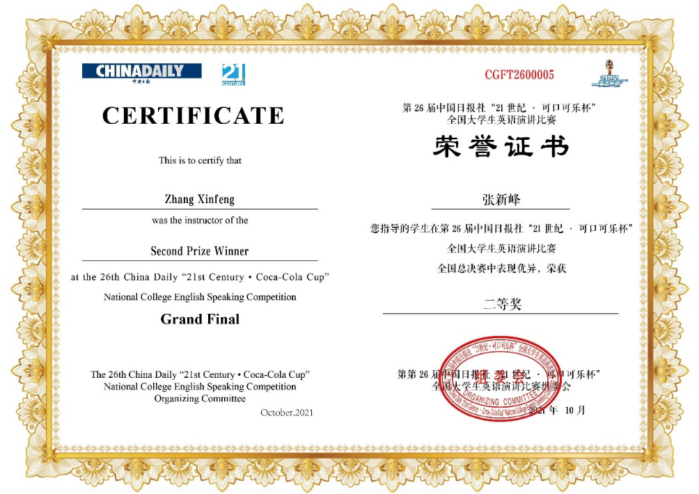 张新峰老师作为参赛学生指导教师荣获的荣誉证书