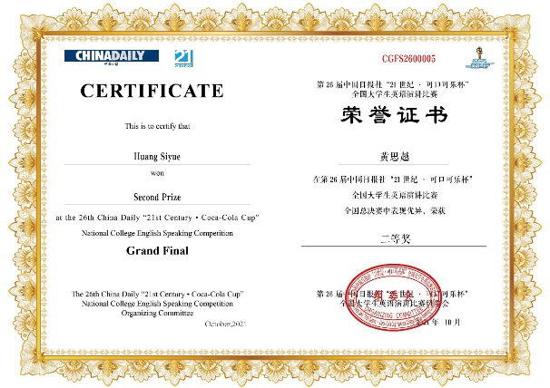 10月6日,《中国日报》社“21世纪杯”全国英语演讲比赛总决赛在成都落下帷幕,经过3天的激烈角逐,乐鱼网页版2019级英语专业黄思越同学表现卓越,脱颖而出,荣获得全国二等奖的佳绩。