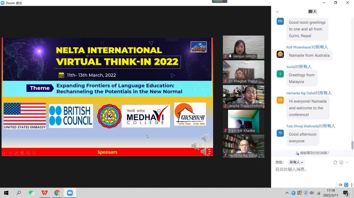 2022年3月11日,乐鱼网页版英语系研究生公共外语教研室主任王文俊副教授,经国际英语教育(TESOL)中国大会选拔与推荐,作为特邀嘉宾参加尼泊尔英语教育协会(NELTA)在线国际会议,并做主旨发言。