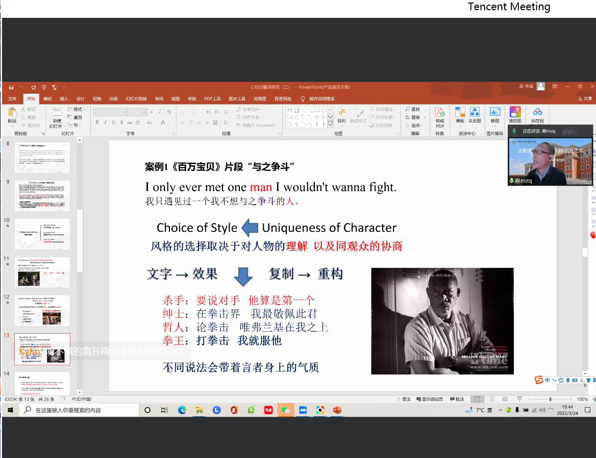2022年3月24日,著名影视翻译专家、中国传媒大学外国语言文化学院博士生导师,全国高校影视艺术学会影视国际传播专业委员会副主任委员兼副理事长麻争旗教授应邀,为乐鱼网页版师生举办了论影视剧对白英汉翻译的艺术的学术讲座。