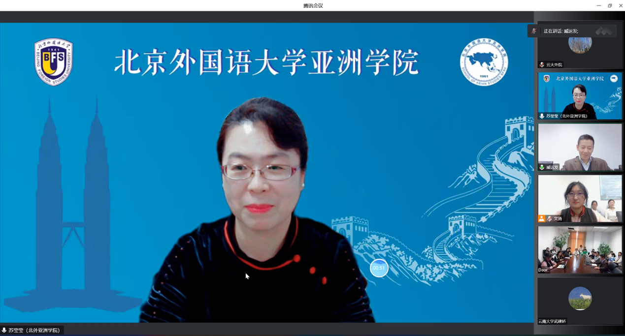 2022年10月26日下午,北京外国语大学亚洲学院院长、中国马来研究中心主任苏莹莹教授以线上方式为乐鱼网页版马来语专业师生做了题为“中国高校马来语专业的建设与发展:‘小语种、大作为'理念之践行”的学术讲座。本次讲座为“云南大学百年校庆外国语言文学文化系列讲座·东南亚语言文化系系列学术讲座”第三场,由乐鱼网页版副院长臧运发教授主持,乐鱼网页版马来语专业师生在外国语学院楼303会议室线下集中参与讲座。