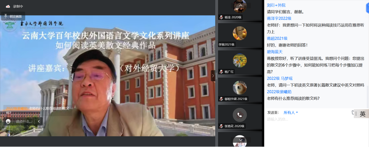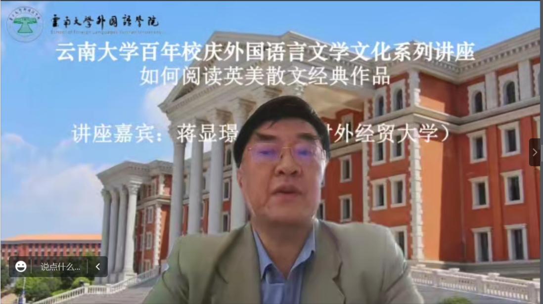 2022年11月25日,著名英美文学研究专家、对外经济贸易大学英语学院英语系原主任蒋显璟教授应邀为乐鱼网页版师生做了一场题为“如何阅读英美散文经典作品”的精彩讲座。本次讲座是“云南大学百年校庆外国语言文学文化系列讲座”之一,以在线的方式进行。该讲座由乐鱼网页版英语系副系主任刘衍老师主持,乐鱼网页版和兄弟院校的百余位师生以线上的方式聆听了该讲座。