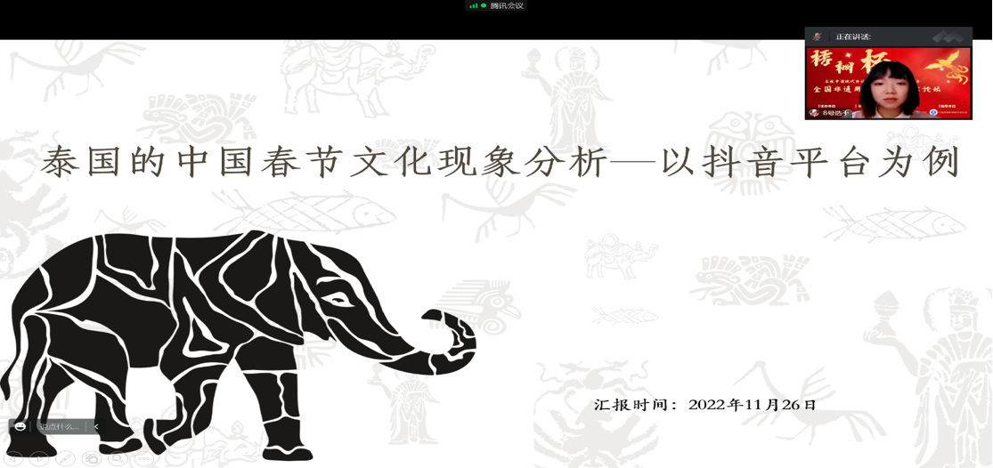 “梧桐杯”第二届全国非通用语大学生学术论坛以“庆祝中国现代外语非通用语高等教育80周年”为契机,由北京第二外国语学院主办,外语教学与研究出版社协办,中国非通用语教学研究会学术指导,北京第二外国语学院亚洲学院承办。乐鱼网页版泰语参赛团队于2022年7月30日提交初赛论文稿,在全国14所高校170余篇论文中脱颖而出,成功进入复赛。乐鱼网页版学生的参赛论文题目为《泰国的中国春节文化现象分析——以抖音平台为例》,文章通过对抖音短视频平台上有关在泰中国春节的文化现象进行分析,对其中的文化元素进行提取,分析背后的原因,进而得到对中华优秀传统文化海外传播方面的启示。